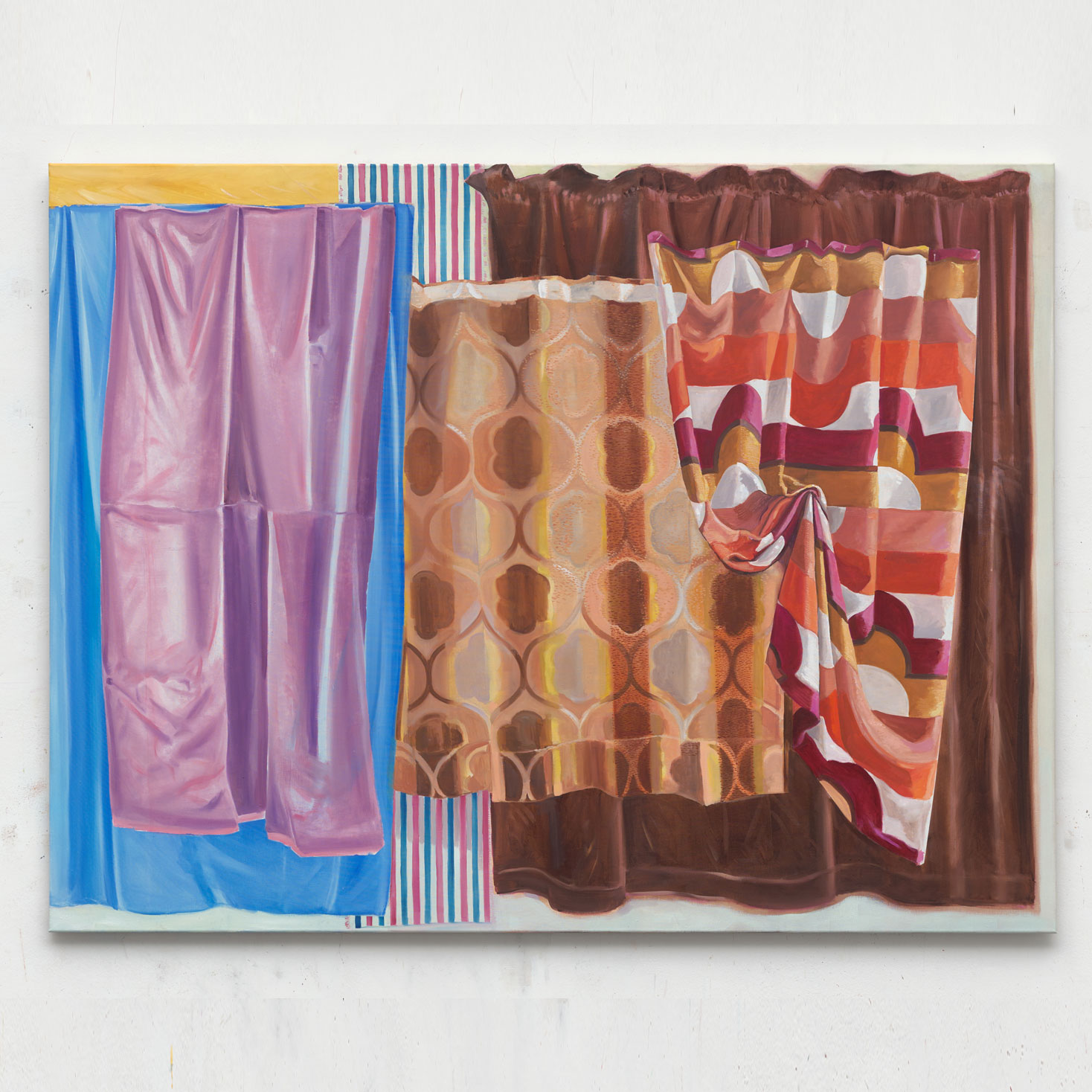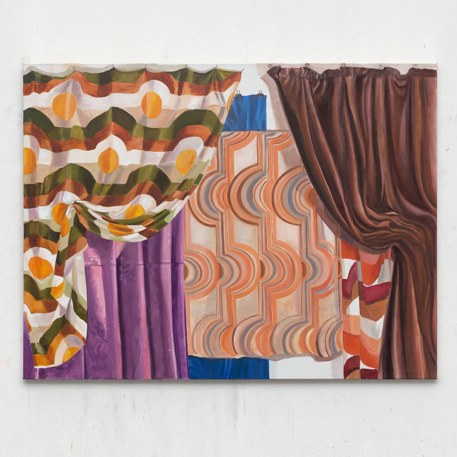 Was verbindet Kioske, Markisen, Sonnenschirme, Zelte, Vorhänge und psychedelische Muster? Sie alle sind Stationen der malerischen Reise von Moni K. Huber. Nicht lediglich leblose Wegmarkierungen, vielmehr Protagonisten einer vielschichtigen Erzählung: einer Geschichte, die an ihrer Oberfläche von mobilen Bauwerken, von provisorischen Behausungen handelt, aber auch von Erinnerungen an Kindheitssommer mit Campingurlauben und dem Gefühl von Freiheit. In der stets unsichtbaren Tiefe hingegen erzählt sie vom Reiz einer bloß durch dünne Zeltwände geschützten Intimität, von einer durchlässigen Membran zwischen Innen und Außen, und vom lustvollen Verdecken und Präsentieren durch Textiles. Moni K. Hubers neugieriger Blick zerlegt das Konstruierte, seziert es säuberlich aus dem ursprünglichen Kontext, wechselt die Achse, zeigt Nahaufnahmen und ferne Perspektiven, nur um sie dann als entseelte Zeltlandschaften, als von psychedelischen Mustern umschlungene Caravans oder als riesenhafte Insekten-Kioske wieder auferstehen zu lassen. Daraus ergeben sich nicht nur ungewohnte Konstellationen, sondern zuweilen auch eine Stimmung der Angst-Lust. Ob aus der Ferne oder im Detail, immer spielt die Künstlerin mit Gezeigtem und Verborgenem, lockt in innerste psychische Welten, die ihr Geheimnis dennoch nie preisgeben. Vielmehr verliert man sich in den samtigen Labyrinthen wie einst in den Filmen von David Lynch. Blue Velvet – ein in Falten geworfener Stoff, der die Fassade heiterer Familiensommer nicht mehr schützt.